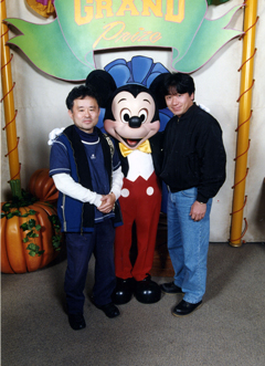 | 本物のミッキーと矢田先生とで記念撮影をしました。本家ミッキーの家は大変人気で混んでいたので、記念撮影まで待たされましたが、良い想い出写真を撮って貰えました。 |