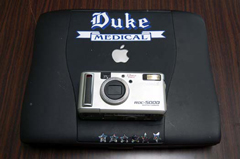 | 日本から持って行ったMacとデジカメ Duke medical centerのシールが貼られている。 双方ともに使っていないが壊れていない。 想い出があってとても捨てられない。 |