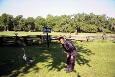 アメリカドライブ旅行の醍醐味を知った矢田先生と私はSouth Carolina の観光地Charlestonに行くことにした。気弱な私でもホテルの電話予約に苦もなく成功。土曜日の早朝出発、四時間半の ドライブで、Charleston手前近郊にある綿花農園(*1)マグノリア・プ ランテーションに到着。広大な敷地内には当時の庭園と邸宅が残されている。大きくきれいな沼(swamp)があるのだが、名物のアリ ゲーターは見ることが出来なかった。
