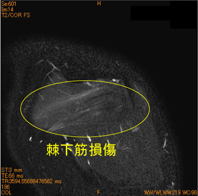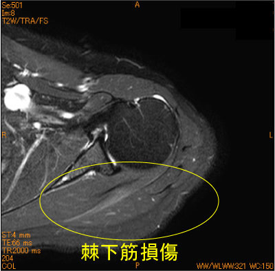 棘下筋に筋挫傷を認めている。腱板断裂疑いであったが、腱板ばかり見ていると見落とす。