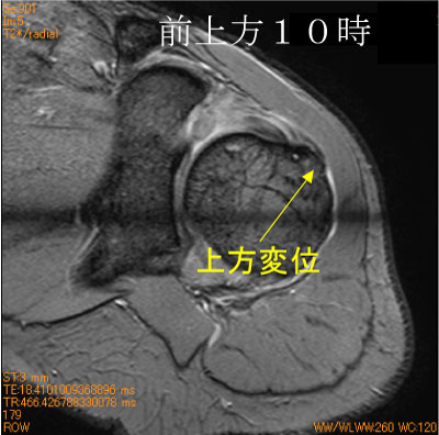 直達外力による骨損傷だが、安静が不十分だと腱板による牽引により上方に変位する。脂肪抑制T2 WI が有用。