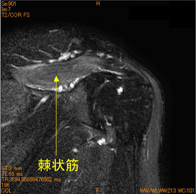 20代男性、疼痛肩、脂肪抑制T2 high changeを三角筋(腋窩神経)、棘上筋、棘下筋(肩甲上神経)を認めている。