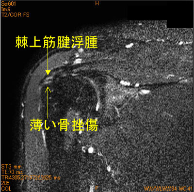 棘上筋腱停止部は僅かに脂肪抑制T2 high signalを認めている。