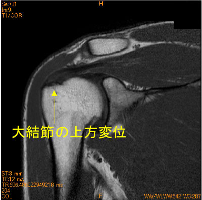 棘上筋腱停止部、大結節superior facet部が上方に変位している。